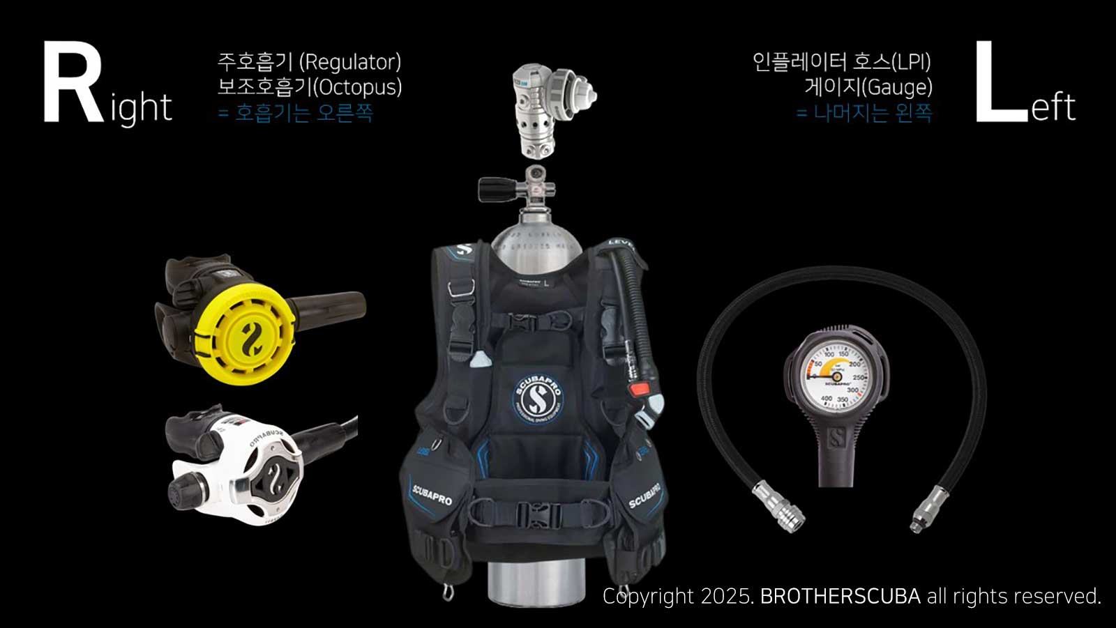 2 호흡기(Regulator)는 BCD를 착용했을 때, 오른쪽으로 두개의 호흡기가 가고 왼쪽으로 나머지 호스들이 가게 세팅합니다